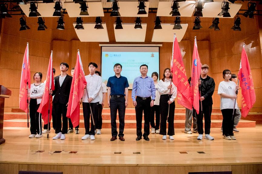 党委书记杨乃军宣布2023年“服务黄河流域生态保护和高质量发展”社会实践启动。张岩书记和杨乃军书记共同为社会实践队伍代表授旗。学生代表-“黄河情,华夏梦”社会实践队叶登峰同学发言。
