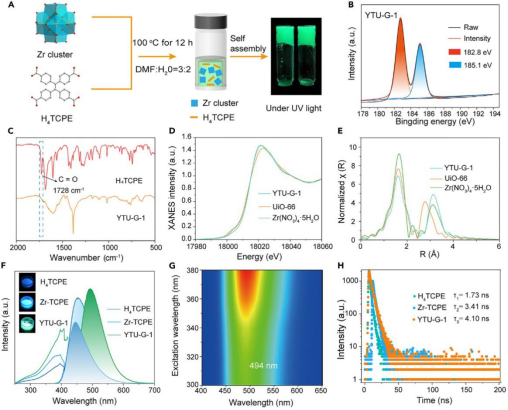 作者通过优化后的温和溶剂热反应条件制备了金属-有机凝胶材料。并采用X射线光电子能谱,红外光谱和同步辐射分析验证了由Zr簇锚定AIE配体自组装成了无序、致密且刚性的凝胶骨架(图2)。此外,凝胶表现出95.5%的量子效率和快速的荧光寿命。