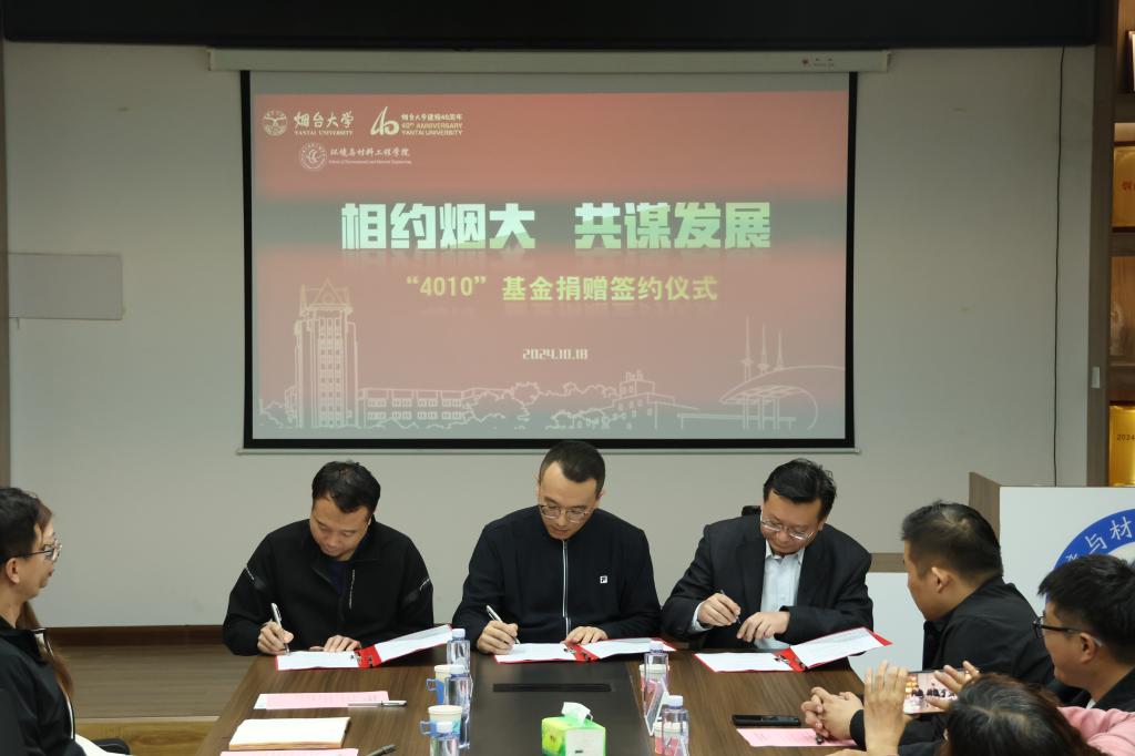 10月18日,环境与材料工程学院“4010”基金捐赠签约仪式在学院337会议室举行。环材学院2010级校友、烟台玥远企业管理咨询有限公司总经理贾洪杰,市场部总监蔡晓军,业务总监张林林,商务经理李志鹏,业务经理李大璐,环材102-2班导师聂惠瑛,学院党委书记杨乃军,院长李晓强,学院党委副书记陈颖,副处级组织员陈雷,副院长孙学勤,副院长刘伟,辅导员以及学生代表参加本次仪式,仪式由学院党委副书记陈颖主持。