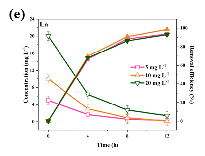 随着初始离子浓度的增加(从5 mg L -120 mg L-1),最大功率密度先增大后减小,这可以用Nernst方程来解释(图3a)。如图3b-f 所示,Co(Ⅱ)、Sr(Ⅱ)和Cs(Ⅰ)在5 mg L-1时具有最大去除效率(< 90 %),而其他两种离子在浓度为10 mg L-1时具有最大去除效率(> 95 %)。与其余三种放射性离子相比,La(Ⅲ)和Ce(Ⅲ)具有较高的氧化还原电位,很容易被还原。