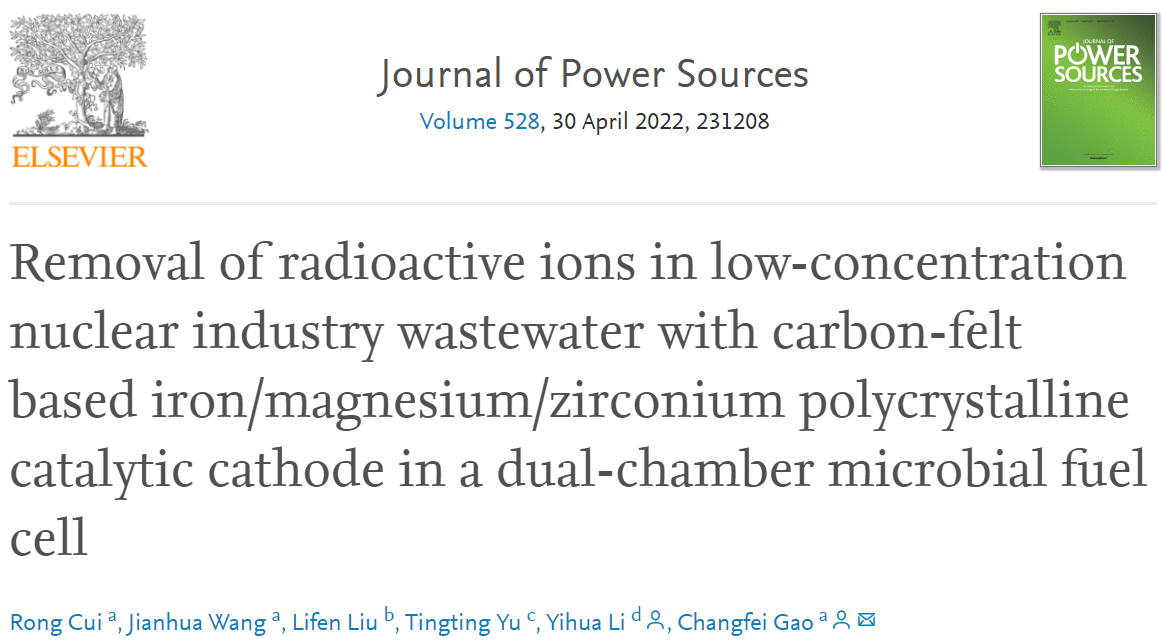 近日,我院高常飞副教授团队在学术期刊Journal of Power Sources发表了题为“Removal of radioactive ions in low-concentration nuclear industry wastewater with carbon-felt based Iron/Magnesium/Zirconium polycrystalline catalytic cathode in a dual-chamber microbial fuel cell”的研究论文。本研究以壳聚糖为前体,通过水热法制备/镁/锆多晶催化阴极,应用于微生物燃料电池,展现出对放射性离子优异的去除性能。本研究不仅为微生物燃料电池提供了一种新型电催化阴极,而且在实际的废水资源处理和回收中具有潜在的应用前景。