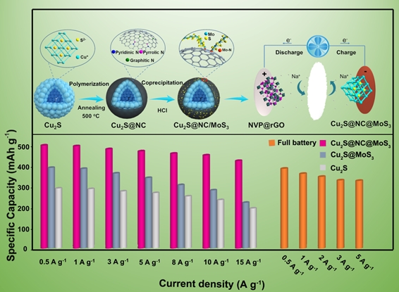 图1Cu2S@NC@MoS3异质结构的合成示意图以及电化学性能