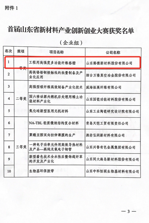在首届大赛中,山东路德新材料股份有限公司凭借《工程用高强度多功能纤维格栅》项目,斩获企业组第一名。根据大赛相关文件,团队第一完成人梁训美按程序申报“山东省五一劳动奖章”,经过山东省总工会的公正评审,最终获评“山东省五一劳动奖章”。