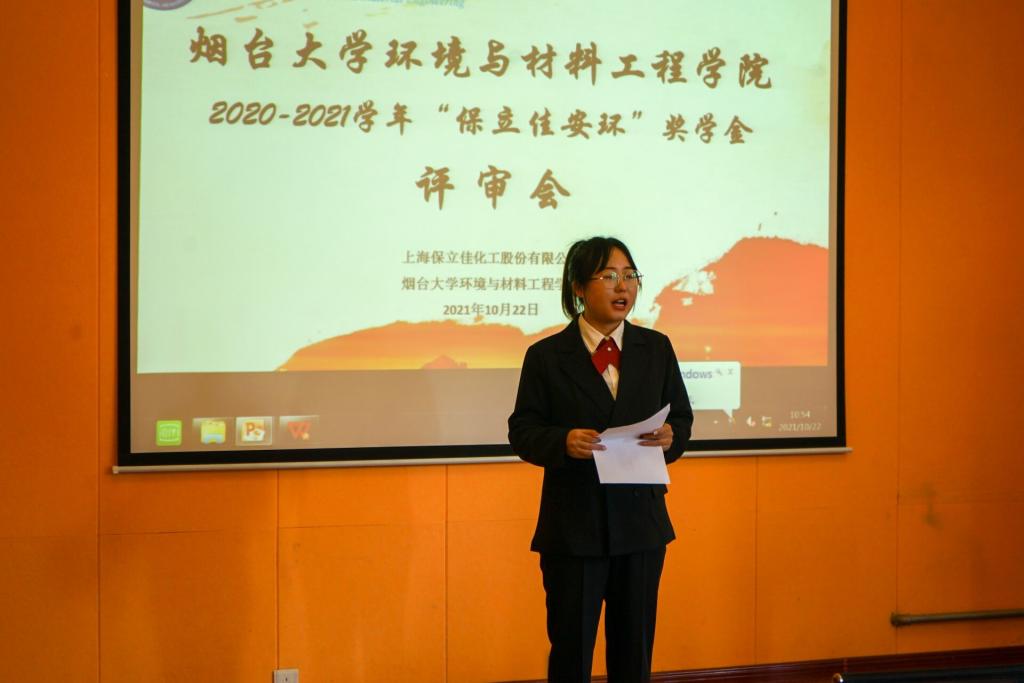 由环境与材料工程学院与上海保立佳化工股份有限公司共同承办的“保立佳安环”奖学金评审会于10月22日上午8:30在环材院管二楼218会议室成功举办。上海保立佳化工股份有限公司培训部经理孙晓明、烟台保立佳生产管理部经理陈炳旭、环材学院党委副书记曲峰、副院长邱剑勋、2020级辅导员倪翠出席本次会议,来自环材学院的13位同学参与答辩。