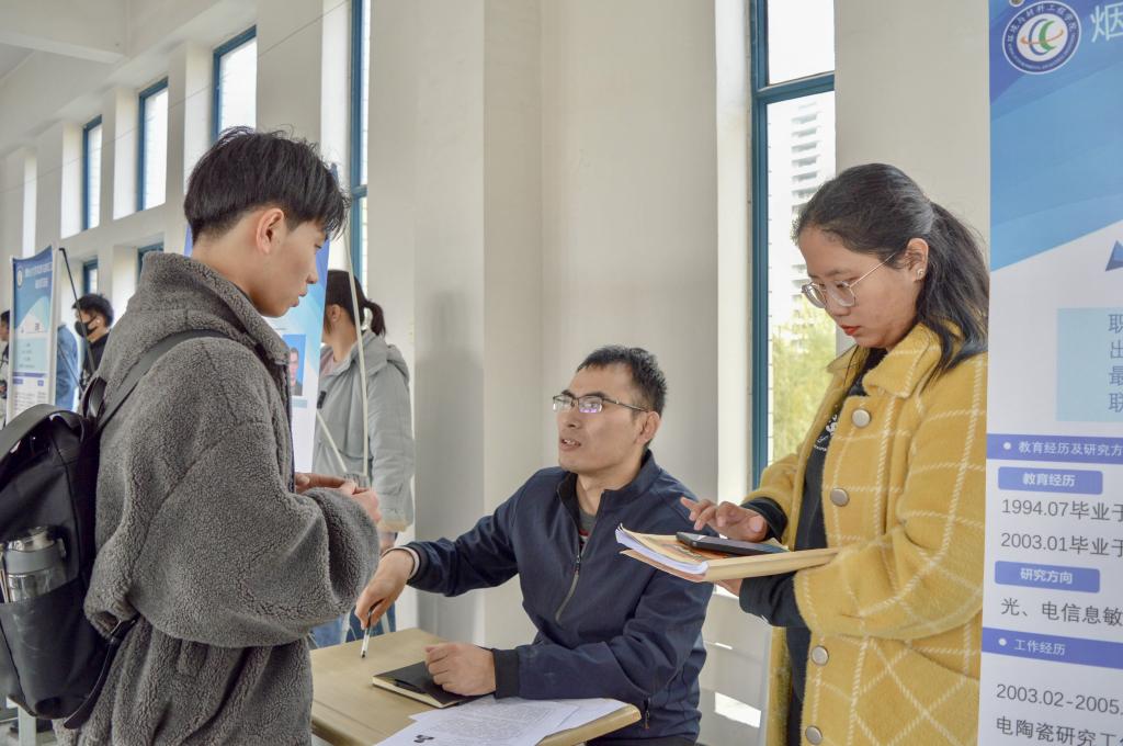 来自环材学院的“新型多孔材料的设计合成及应用,亚稳态AI2O3/ZrO2粉末的制备与烧结特性研究,离网独立供电储能电池系统的开发,电化学储能相关领域,电池储能材料研究,人工晶体、光学与能源材料、半导体芯片材料及器件,光、电信息敏感材料与器件,可再生能源供电脱除废水重金属离子装置的开发,淡水鱼中砷形态分布差异的机制研究”等研究领域的多位专业老师和硕士研究生、本科生参与到此次的科创双选会当中。