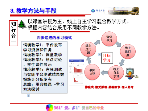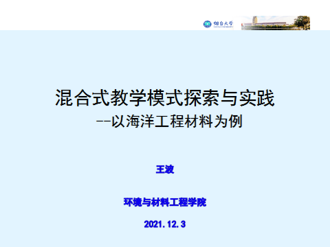王波老师自2017年将《建筑功能材料工艺学》、《海洋工程材料》建设为在线课程,获得了较好的教学效果,《海洋工程材料》被评为烟台大学优秀课程思政示范课。王波老师以《海洋工程材料》课程建设和教学过程为例,为大家详细介绍了搭建移动式在线教学平台的思路和方法;如何将在线学习和课堂授课有机结合起来;如何采用多元化考核评价体系,诊断学生学习过程,培养学生自主学习能力;如何借助混合式教学模式为课堂注入新动力和新活力。