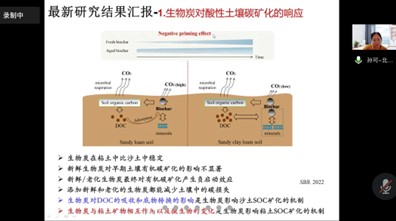 论坛第四期主题为“双碳背景下的土壤研究”,国家杰出青年科学基金获得者、北京师范大学环境学院孙可教授和林春野教授受邀进行线上报告。孙可教授的研究主要围绕生物炭组成结构、土壤质地、田间老化和外源有机质输入对生物炭稳定性的影响和新鲜/老化生物炭对土壤本底有机碳的激发效应及产生机制,探究了新鲜和老化生物炭对不同土壤CO2排放的影响,并阐述了具体的影响机制。林春野教授聚焦重金属污染物在土壤中的迁移转化过程,结合有色冶炼场地案例,向与会师生介绍了土壤污染生态风险和健康风险评价模型,阐明了重金属形态和生物可用性特征,并介绍了儿童土壤摄入量(单位时间内无意识或有意识地摄入土壤的质量)研究方法。最后探讨土壤重金属污染领域未来研究热点。