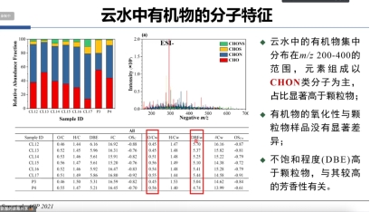 毕新慧研究员的研究领域为大气气溶胶的物化性质表征及环境气候健康效应。主持多项国家自然科学基金项目,在环境领域重要期刊发表SCI论文150余篇,入选全球前2%顶尖科学家榜单。毕新慧研究员在报告中指出,模式预测云雾过程可能是大气二次有机气溶胶形成的重要途径之一,而目前对云雾过程二次有机气溶胶的形成演化机制仍不明确。其团队利用傅里叶变换离子回旋共振质谱和紫外可见分光光度仪,表征了云水中有机物的分子组成特征和光学特性;对云事件中的云残余颗粒、云间隙颗粒和无云背景颗粒进行了单颗粒组分在线观测,原位追踪了云中过程二次有机气溶胶的形成。研究结果表明,云中过程可促进二次有机气溶胶的形成;云中形成的有机物会影响黑碳的形貌和混合结构,从而对其光吸收增强产生影响。