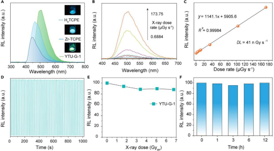 随后,对金属-有机凝胶的闪烁性能进行了测试。实验表明,凝胶表现出明亮的辐射发光,44 nGy s-1的剂量检测限 (远低于医用标准诊断剂量,5.5 uGy s-1)和出色的稳定性(图3)。