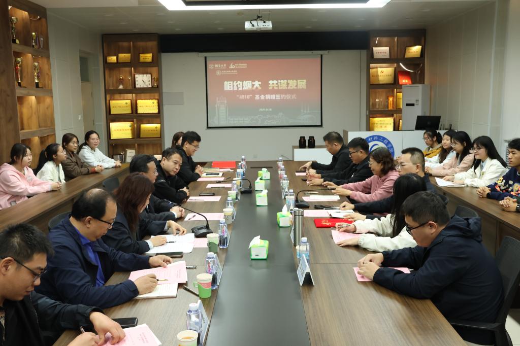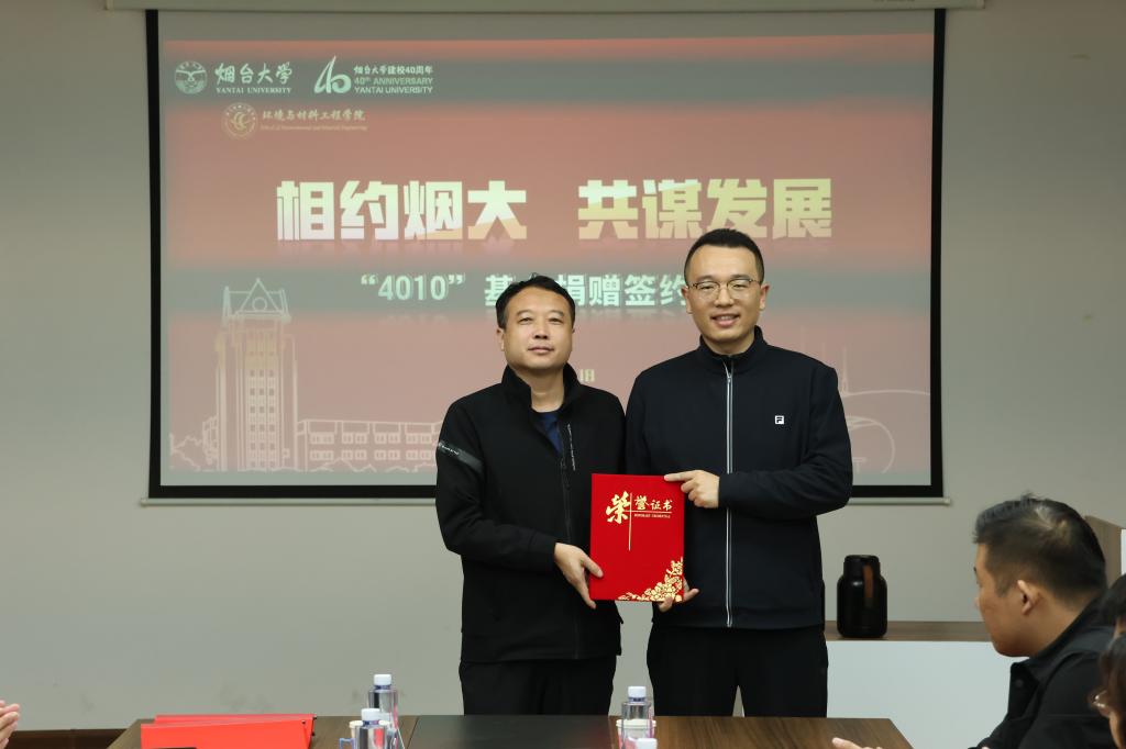 10月18日,环境与材料工程学院“4010”基金捐赠签约仪式在学院337会议室举行。环材学院2010级校友、烟台玥远企业管理咨询有限公司总经理贾洪杰,市场部总监蔡晓军,业务总监张林林,商务经理李志鹏,业务经理李大璐,环材102-2班导师聂惠瑛,学院党委书记杨乃军,院长李晓强,学院党委副书记陈颖,副处级组织员陈雷,副院长孙学勤,副院长刘伟,辅导员以及学生代表参加本次仪式,仪式由学院党委副书记陈颖主持。