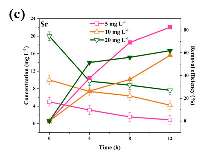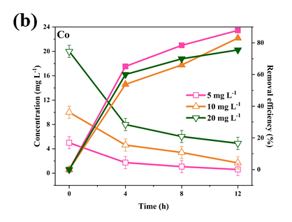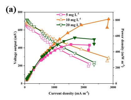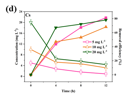 随着初始离子浓度的增加(从5 mg L -120 mg L-1),最大功率密度先增大后减小,这可以用Nernst方程来解释(图3a)。如图3b-f 所示,Co(Ⅱ)、Sr(Ⅱ)和Cs(Ⅰ)在5 mg L-1时具有最大去除效率(< 90 %),而其他两种离子在浓度为10 mg L-1时具有最大去除效率(> 95 %)。与其余三种放射性离子相比,La(Ⅲ)和Ce(Ⅲ)具有较高的氧化还原电位,很容易被还原。