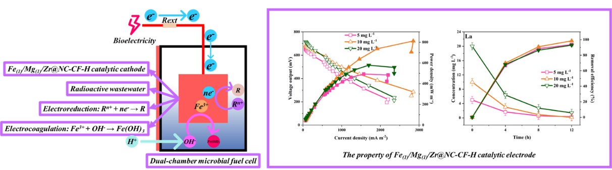近日,我院高常飞副教授团队在学术期刊Journal of Power Sources发表了题为“Removal of radioactive ions in low-concentration nuclear industry wastewater with carbon-felt based Iron/Magnesium/Zirconium polycrystalline catalytic cathode in a dual-chamber microbial fuel cell”的研究论文。本研究以壳聚糖为前体,通过水热法制备/镁/锆多晶催化阴极,应用于微生物燃料电池,展现出对放射性离子优异的去除性能。本研究不仅为微生物燃料电池提供了一种新型电催化阴极,而且在实际的废水资源处理和回收中具有潜在的应用前景。
