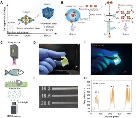 鉴于此,烟台大学刘伟教授团队采用温和的溶剂热方法构建了一种新型的聚集诱导有机凝胶闪烁体材料。这种新材料具有刚性和致密的结构,实现了95.5%的量子效率和44 nGy s-1的低辐射检测限。制备的柔性闪烁膜的空间成像分辨率达到20 lp mm-1,为无机和有机样品提供了高分辨率成像的能力。这项工作为开发基于金属有机凝胶的闪烁材料提供了一种创新的策略,为构建新型高性能X射线探测和成像材料提供了一个创新的示范。