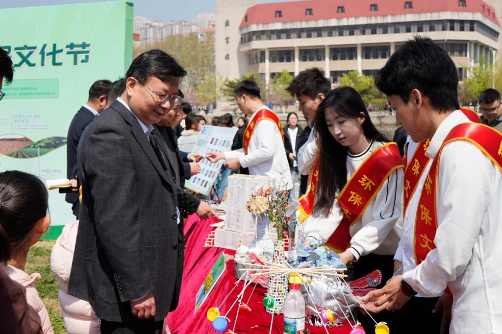 本届环保文化节以“珍爱地球 人与自然和谐共生”为主题,以文化传承、学术创新、实践拓展为主线,开展九大系列活动,旨在推动生态文明理念与校园文化深度融合,激发青年学子投身绿色发展的使命担当。“以我青春之名,守护绿水青山;以我科学之志,助力双碳目标!”环保大使代表周怡臻带领全场宣誓,铿锵誓言展现了烟大学子守护绿水青山的决心。与会嘉宾现场参观文创展示区、变废为宝作品及社会实践成果,件件作品彰显了青年学子将理论融入实践的创新活力。